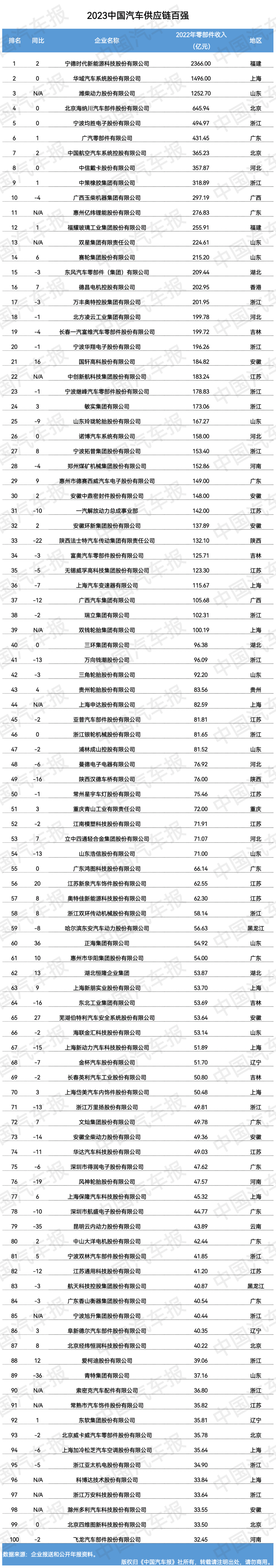 6月28日,《2023全球汽车供应链核心企业竞争力白皮书》正式发布,在其公布的“2023中国汽车供应链百强”中,依据2022年零部件收入统计,宁德时代以2366亿元位居第一位、华域汽车以1496亿元位居第二位、潍柴动力以1252.7亿元位居第三位,且是仅有的3家零部件业务收入过千亿元的企业。