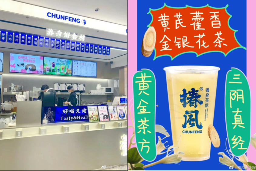 这些品牌,拥有明确的“养生”定位,也拥有更丰富甚至是出其不意的养生系列产品。以椿风为例,它不仅有熬夜大补水、刮油水、小吊梨汤等养生茶“标配”,还开发出了袪湿茯苓百合薏米水、胶原三宝鲜奶茶、菊花柠檬百香果等“功能性”茶饮。