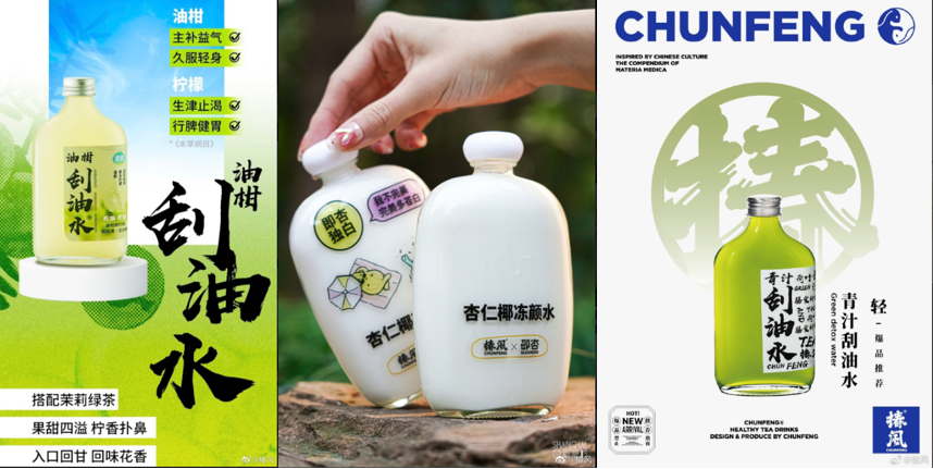 与熬夜水几乎同期,我们还迎来了“刮油水”、“美颜水”、“润肺汤”等各种各样的“养生水”。极具代表性的产品有青汁刮油水、油柑刮油水、桃胶银耳素颜水、小吊梨汤等等。