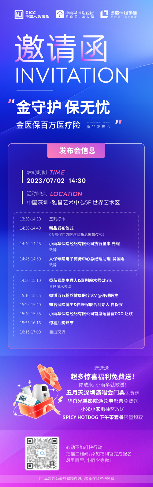 据了解,小雨伞保险经纪执行董事光耀与人保寿险电子商务中心总经理助理吴国君将为本次发布会致辞。届时,番茄喜剧主理人&喜剧魔术师Chris将在现场带来喜剧魔术表演,为观众带来别致的发布会体验。此外,微博百万粉丝健康医疗大V@许超医生与自来保联合创始人自保叔将出席本次发布会进行专业领域知识分享。发布会上,小雨伞保险经纪首席运营官COO赵欢也将带来更详细的产品亮点介绍。