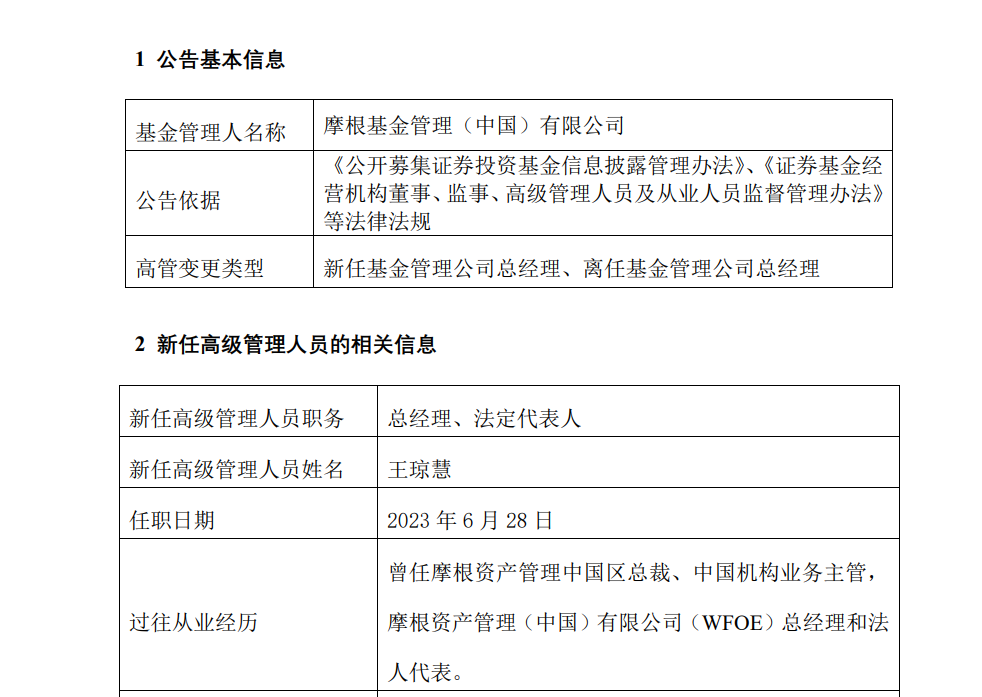 公开资料显示,王琼慧于2008年加入摩根资产管理,2009年起担任中国机构业务主管,2014年就任中国区总裁,2016-2021年间兼任摩根资产管理(中国)有限公司(WFOE)总经理和法人代表。王琼慧拥有超过23年金融行业经验,加入摩根大通前曾任职于贝莱德资产管理公司和中国工商银行总行。