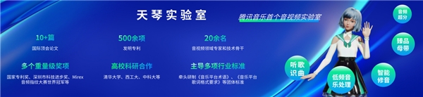2020年,腾讯音乐成立了天琴实验室,专注于音频、视频、AI等前沿技术领域。成立以来天琴实验室在音频、视频技术领域成绩斐然,累计获得10篇以上国际顶会论文与500余项发明专利,收获包括国家专利奖、深圳市科技进步奖、Mirex音频指纹大赛世界冠军等多个国内外音视频重量级奖项,并主导参与多项音乐行业标准制定,目前业已成为行业内顶尖的音视频研究实验室。