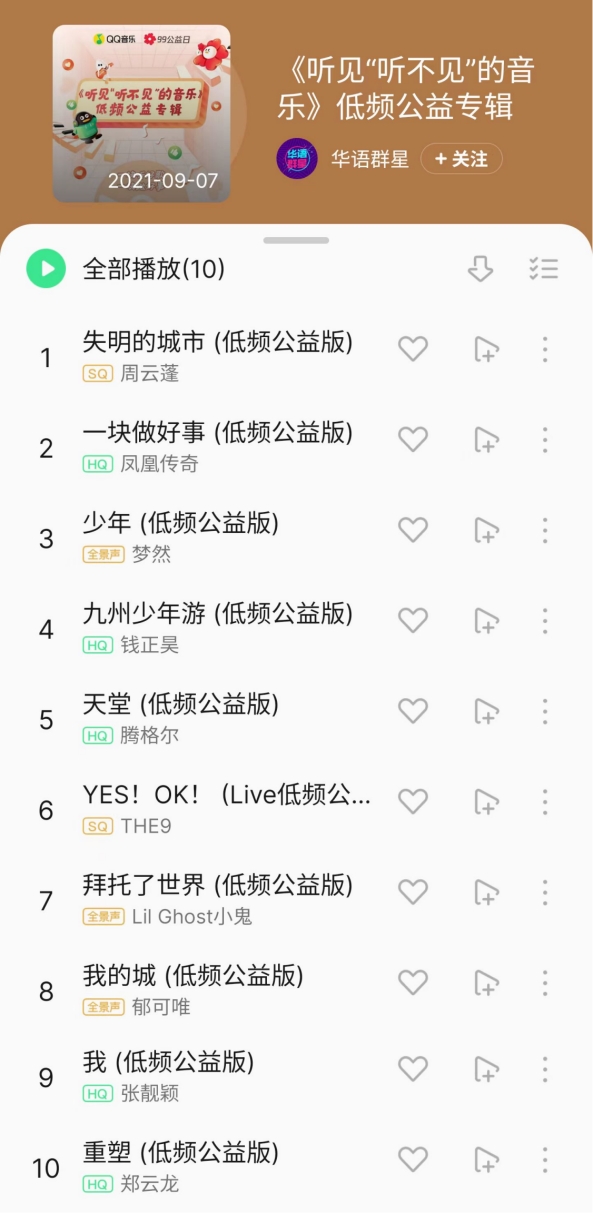 2021年,QQ音乐推出了针对听障人群的QQ音乐推出了国内首张低频公益专辑《听见“听不见”的音乐》,里面收录了腾格尔、张靓颖、郁可唯、凤凰传奇等知名歌手的歌曲,上线一年的时间里,专辑播放量就超过了7000万次。