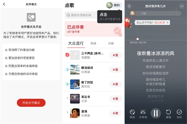 作为国民级K歌娱乐软件——全民K歌,也针对老年人推出了“关怀模式”,根据老年人的喜好做了特别的配置。比如,关怀模式下会更多给老年人推荐他们喜欢的歌曲。同时,在K歌调音功能中也会有老唱片等音色供老年用户选择。