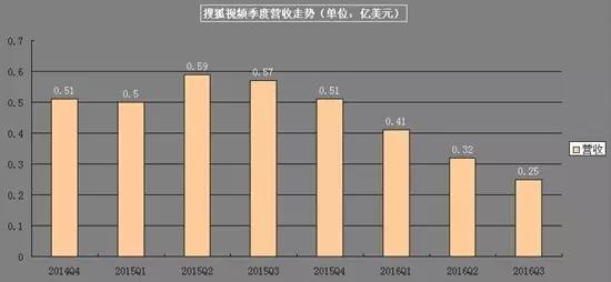 搜狐视频虽然起步较早,然而,在BAT三家视频网站围攻下,搜狐视频的营收已自去年3季度开始连续下降。2016第三季度,搜狐视频营收为2500万美元,同比下滑54%。