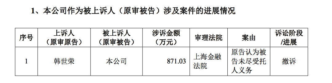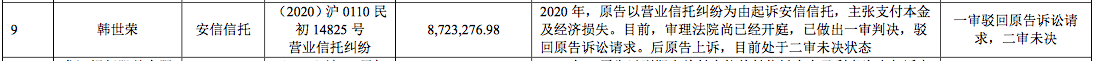 界面新闻查阅过往公告,投资者韩某的案件此前状态为二审未决,案号为(2020)沪0110民初14825号 营业信托纠纷。