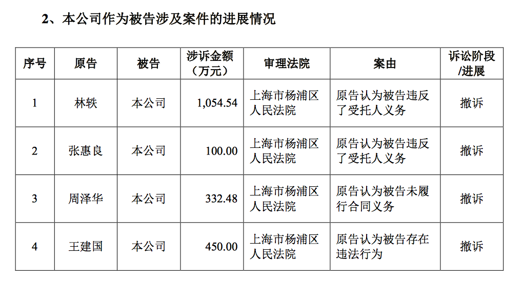 二是建元信托作为被告涉及案件有4宗,受理法院为上海杨浦区人民法院投资者林某、张某、周某、王某撤诉,撤诉金额总计1937.02万元。