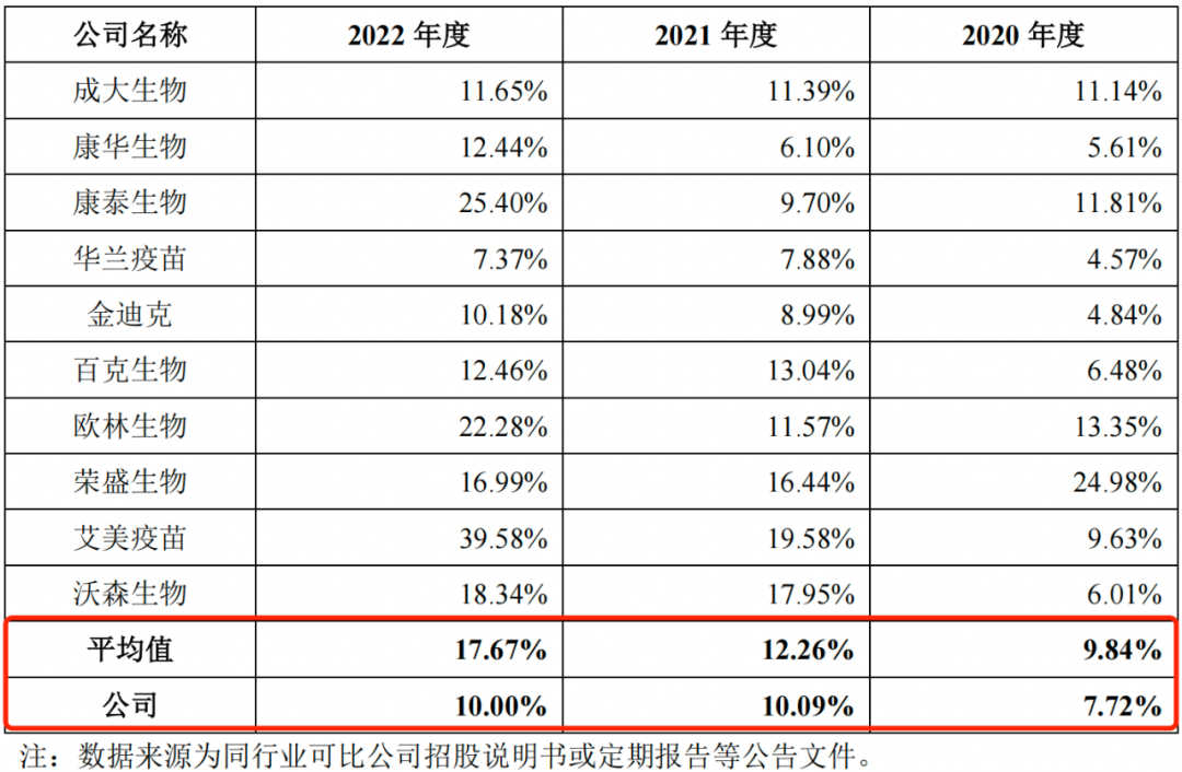 而卓谊生物的同行业可比上市公司的研发费用率均值分别为9.84%、12.26%和17.67%。卓谊生物的研发费用率均低于同行公司。