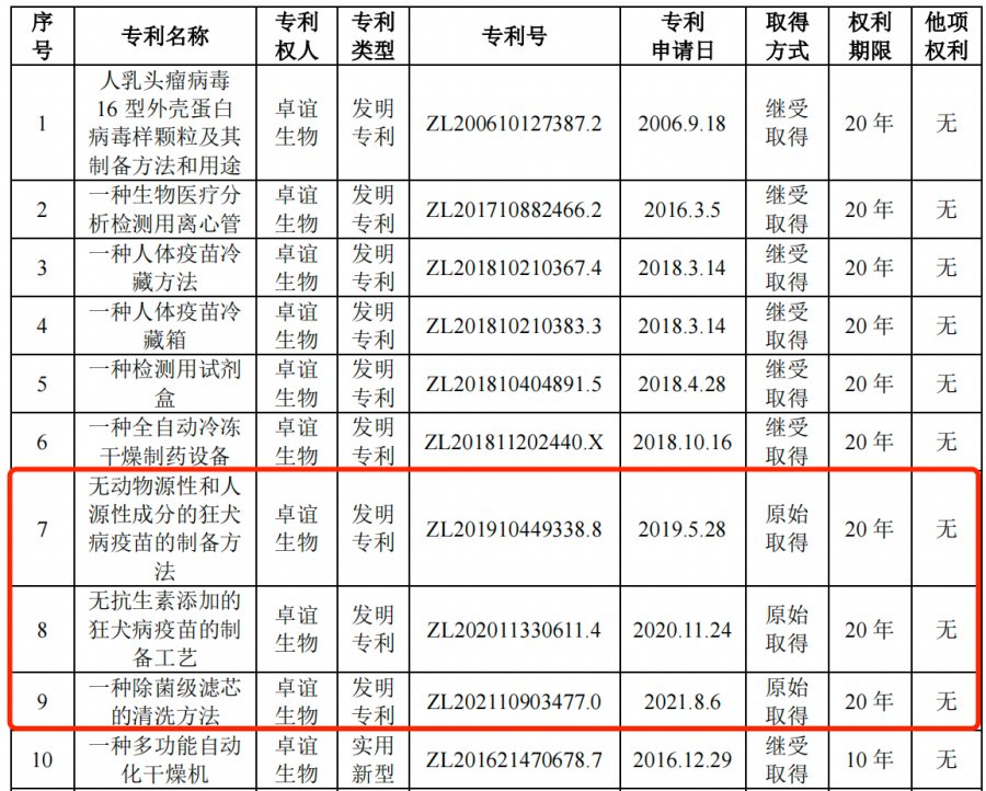 截至招股书签署之日,卓谊生物已累计取得境内发明专利仅有9项,且绝大部分都是在2020年之前取得。其中,3项发明专利的取得方式是原始取得,其余6项发明专利均是继受取得。