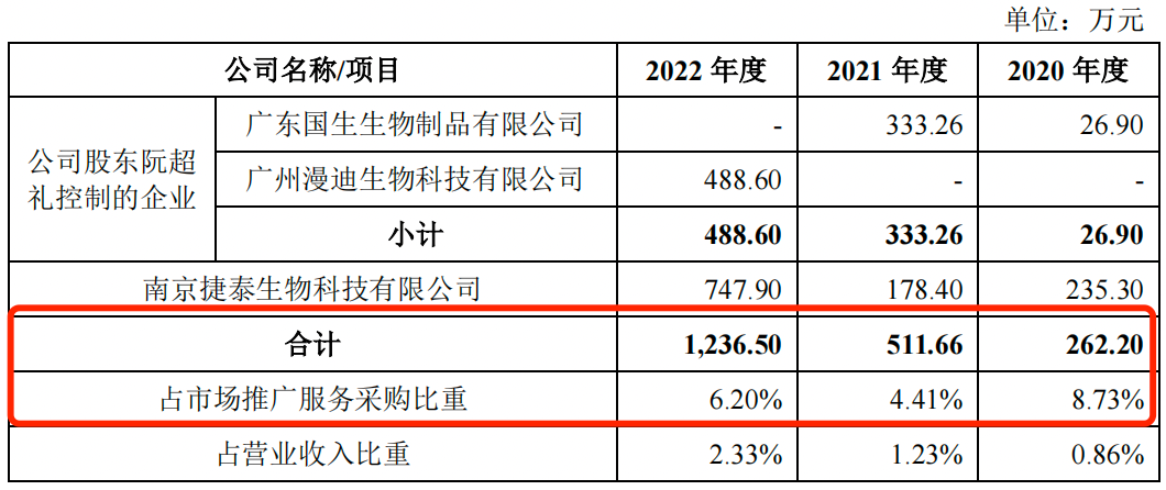招股书显示,报告期内,卓谊生物向部分关联方采购市场推广服务金额分别为262.20万元、511.66万元和1236.50万元,占市场推广服务采购比重分别为8.73%、4.41%和6.20%。