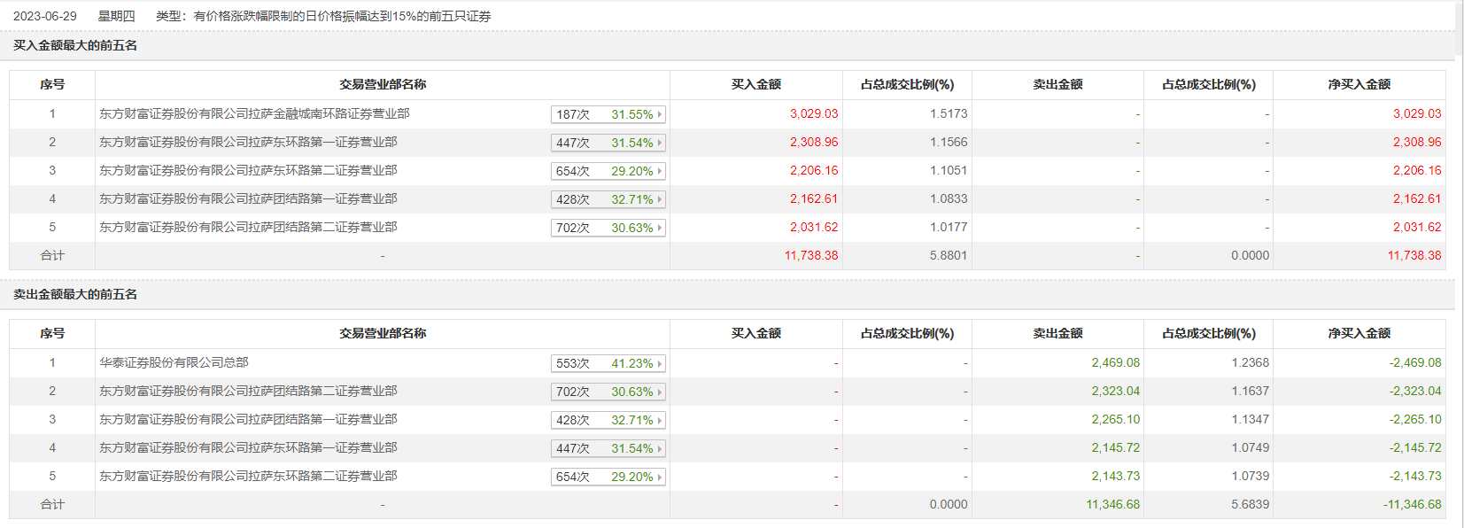 具体来看,华泰证券总部、东方财富证券拉萨团结路第二证券营业部分别卖出2469.08万元、2323.04万元;东方财富证券拉萨金融城南环路证券营业部、东方财富证券拉萨东环路第一证券营业部分别买入3029.03万元、2308.96万元。