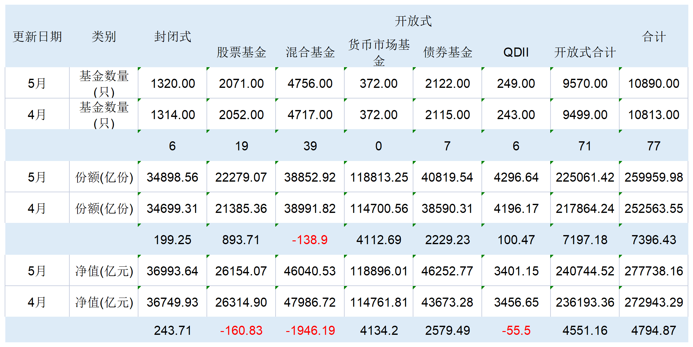 今日,证券基金业协会公布了5月份的公募基金市场数据。