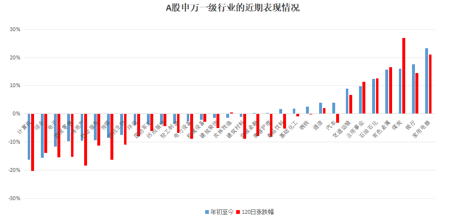 近期A股各个板块之间的行情也有较为明显的分化。Wind数据显示,以申万一级行业分类为参考,各行业今年以来以及近120日的涨跌幅整体分化明显,其中家电行业年初至今的涨幅高达23.27%,而计算机行业年初至今的涨幅仅为-16.32%。