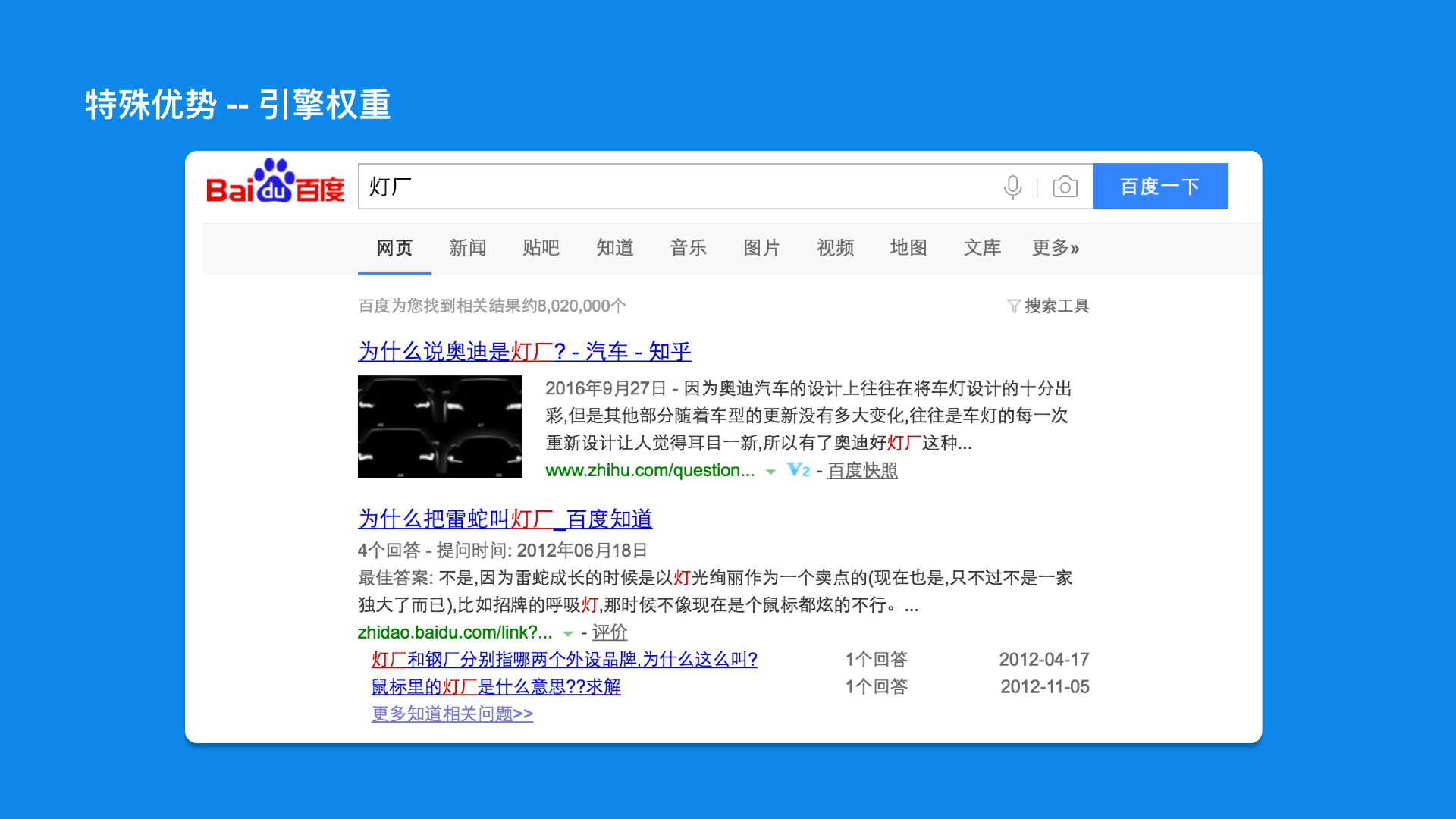 知乎内容在百度的搜索中的展示权重为最高级(10级)(举例:百度搜“灯厂”,在搜索栏中首先出现的是“为什么说奥迪是灯厂? - 汽车 - 知乎”,度娘也终于做了件好事)。