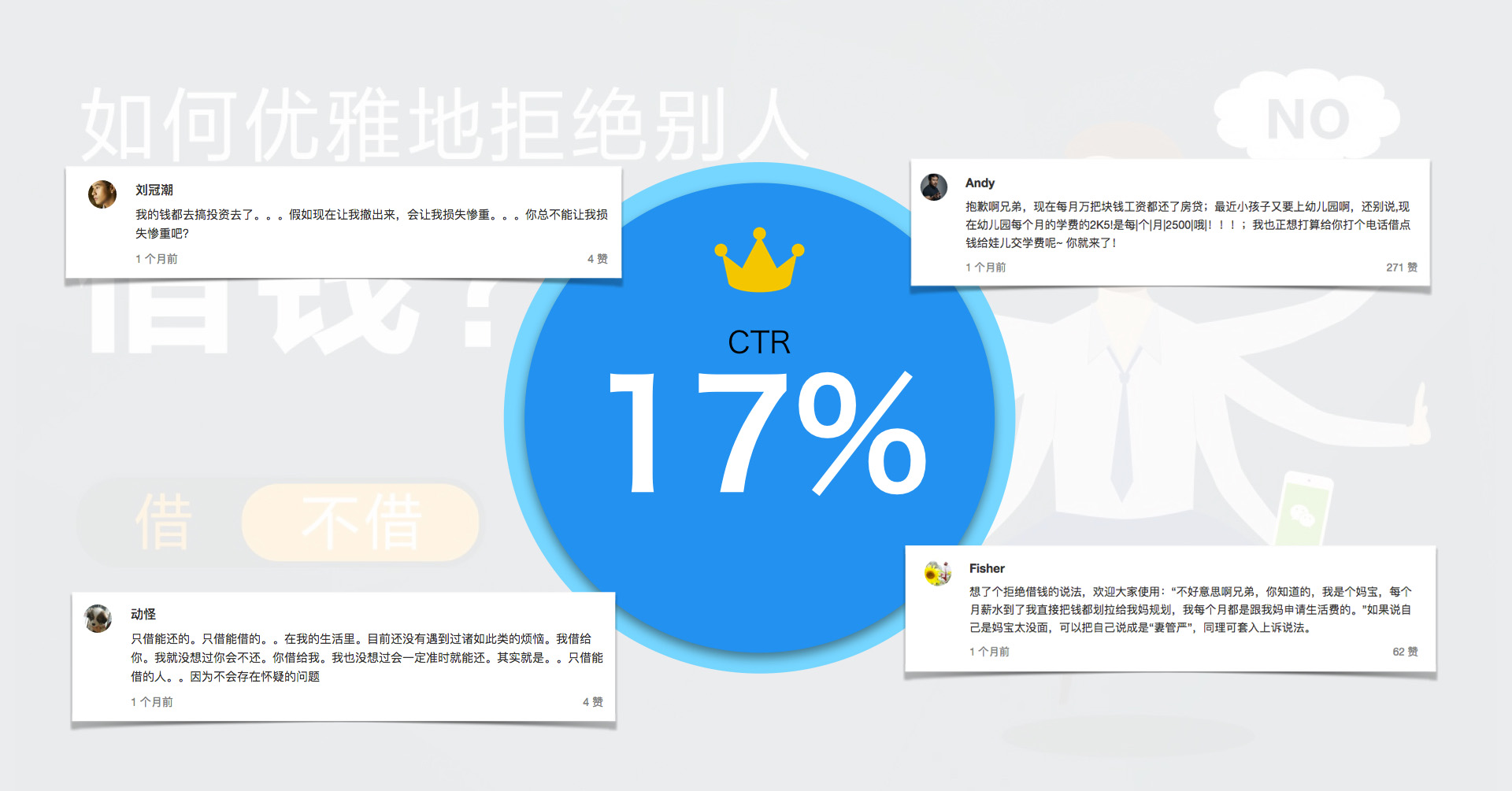 互联网借贷产品“微粒贷”,瞄准高职高收入人士的敏感区,用争议性话题“朋友问你借钱,借还是不借”开启讨论,再以“如何优雅地拒绝别人借钱”的原生文章广告,引出产品优势。成功完成网络借贷教育。