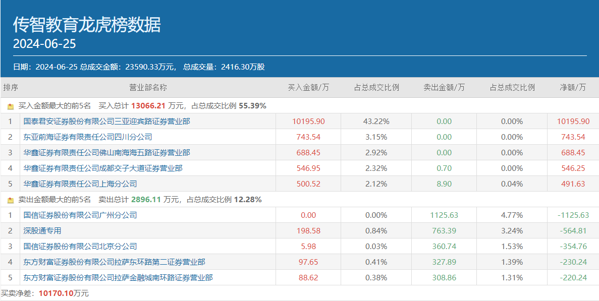 当日披露的龙虎榜数据显示,知名游资佛山系的常用席位国泰君安证券三亚迎宾路高居传智教育买方榜首,买入金额为1.02亿元,占该股当日总成交额的比例高达43.22%。