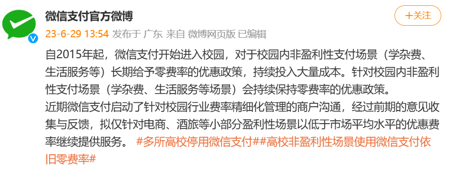 近日,关于多所学校停用微信支付的消息登上了微博热搜。西北大学发布的公告称, 因腾讯公司微信支付将于7月1日起对校园场景用户进行精细化管理,除收学费外,其它收费均会受到限制并收取 0.6%的手续费,因此暂停提供微信扫码支付服务。