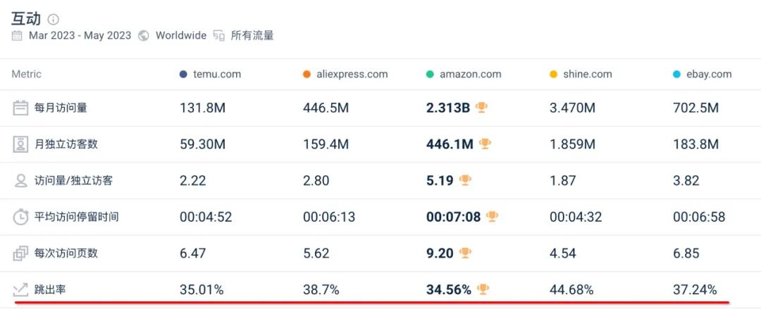 “为了了解Temu的实际活跃度,我在网站数据研究平台Similar web对比了亚马逊、SHEIN、速卖通、ebay等网站的数据,从跳出率来看,Temu优于大部分网站,仅次于亚马逊,这也意味着,Temu确实吸引到了有购买意愿的活跃用户。”