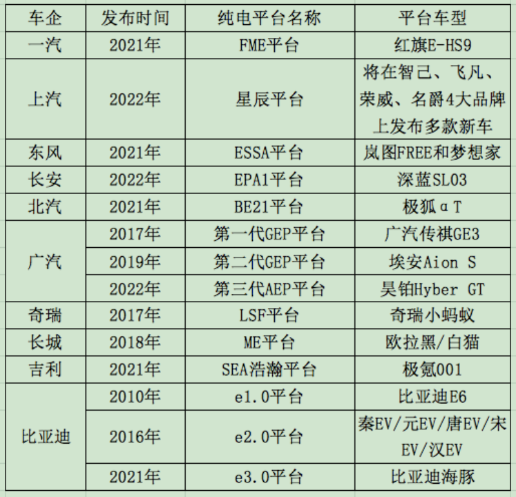 所以,我们就能够从车企发布自家纯电平台的车型和时点,来窥探上述大型车企对新能源趋势的意志,具体信息如下图所示。