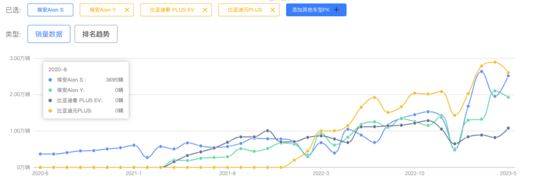 根据销售数据显示,埃安的A级轿车/SUV(也就是Aion S/Y车型)的合计销量已经连续4个月(即2-5月份)超过其对应的比亚迪的A级轿车/SUV(也就是秦plus EV/元plus车型)。