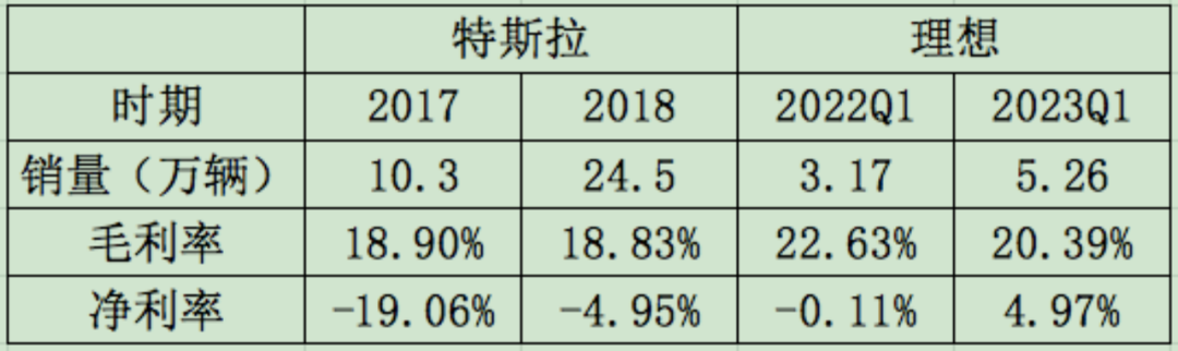 2022年埃安的年均产能达到了20万以上,产销规模扩大了一倍,这必然会影响公司的经营数据,这里选取特斯拉和理想在这一阶段的数据变化来做参考依据。之所以理想只选取了Q1数据,是因为2022年理想在下半年进行了大规模产线切换,全年数据有明显的噪音扰动。