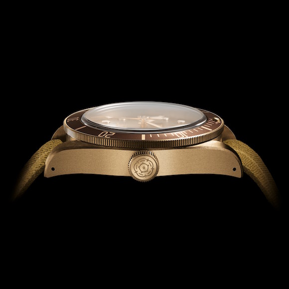 表壳周身全部经过拉丝处理。在贴合皮肤的底盖部分,帝舵考虑到皮肤长期接触铜后可能产生过敏,于是采用了精钢材质,并特意做出古铜色PVD处理。为更完整地体现复古感,Heritage Black Bay Bronze表耳引入了穿耳设计。抢眼的上链表冠则源于帝舵1958 年推出的大“表冠”表款(型号 7924), 侧面刻有帝舵玫瑰标志。