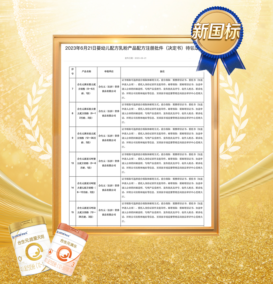 近日,国家市场监督管理总局发布最新一批“婴幼儿配方乳粉产品配方注册批件(决定书)待领取信息”名单,健合集团旗下合生元新增2个系列,6大配方奶粉注册申请成功获批。截止到6月21日,健合集团旗下共17个婴幼儿配方奶粉都已成功通过新国标注册,合生元派星天呵、合生元满乐成为又一批充分展示健合卓越品质的产品。