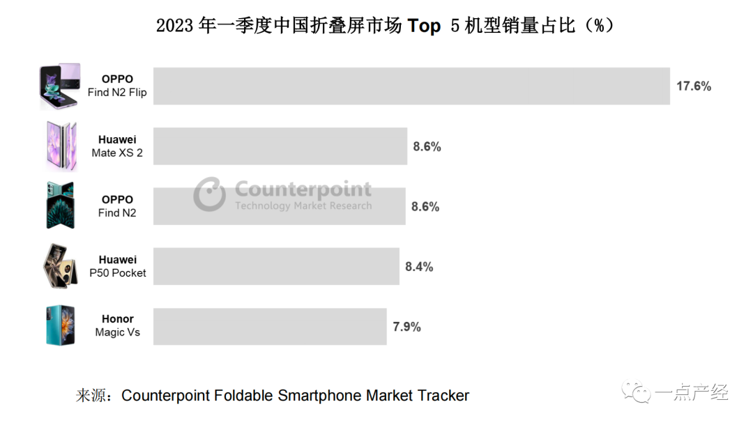 《一点产经》看到,在2023年第一季度中国折叠屏市场销量占比中,荣耀Mgiac Vs排名仅位居第五,不敌OPPO和华为的部分机型。