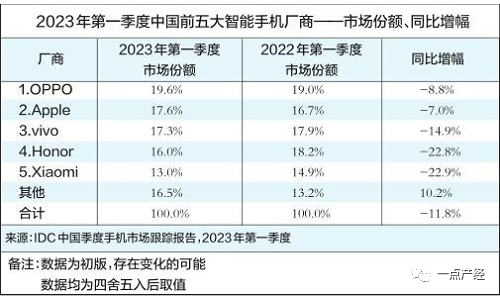 据IDC公布的2023年一季度国内智能手机市场排名显示,荣耀同步下滑22.8%,市场排名第四,巅峰时期这家公司曾登顶过中国市场销量第一的位置。