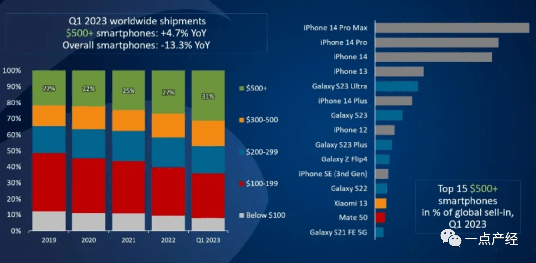 据市场研究机构Canalys发布的2023年第一季度全球智能手机市场-高端细分市场(500美元以上智能手机)报告显示,荣耀没有机型进入全球高端手机15强。