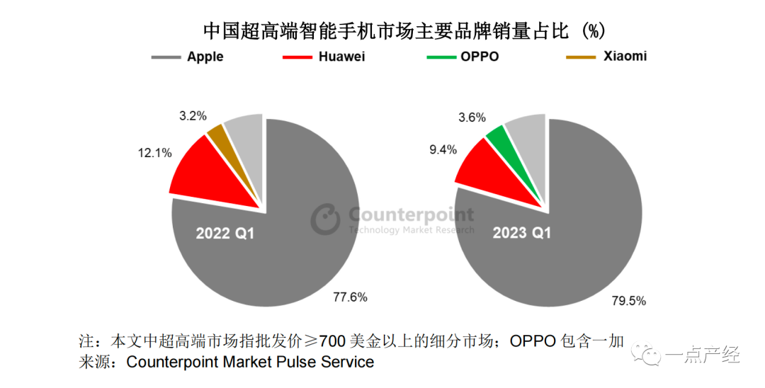 可以看到华为手机在中国高端手机市场份额依旧极高,稳居前二的位置。