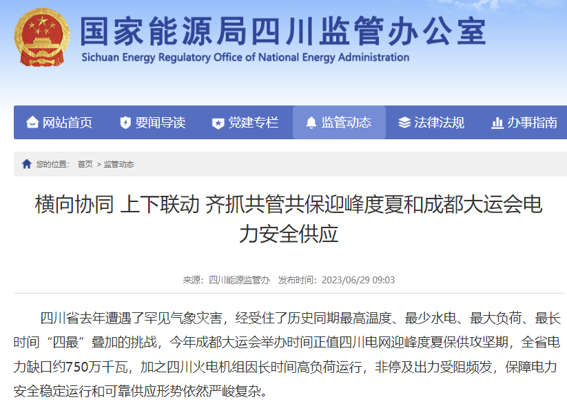 四川能源监管办官网消息,四川省去年遭遇了罕见气象灾害,经受住了历史同期最高温度、最少水电、最大负荷、最长时间“四最”叠加的挑战,今年成都大运会举办时间正值四川电网迎峰度夏保供攻坚期,全省电力缺口约750万千瓦,加之四川火电机组因长时间高负荷运行,非停及出力受阻频发,保障电力安全稳定运行和可靠供应形势依然严峻复杂。