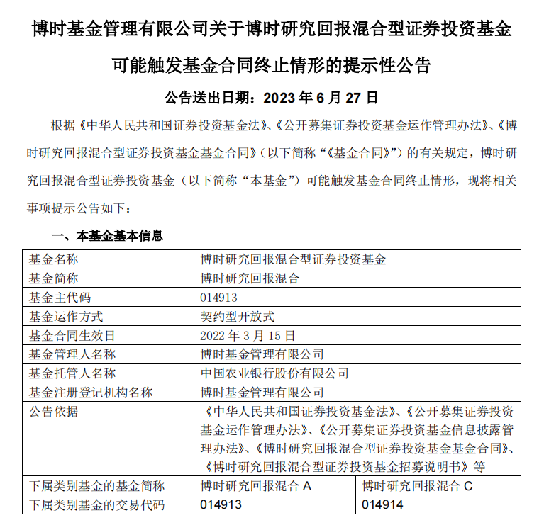 6月27日,博时基金发布了旗下产品博时研究回报混合可能触发基金合同终止情形的提示性公告,表示截至2023年7月24日,若基金出现连续50个工作日资产净值低于5000万元,将根据基金合同约定进入清算程序,无需召开基金份额持有人大会进行表决。