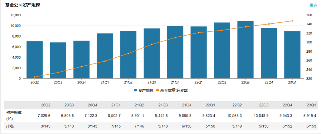 作为行业老五家,2020年上半年末时,博时基金公募基金规模为7029.6亿元,行业排名第3位。截至2023年一季度末,博时基金公募基金规模为8919.4亿元,在153家基金公司中排名第6位,滑出前5名。