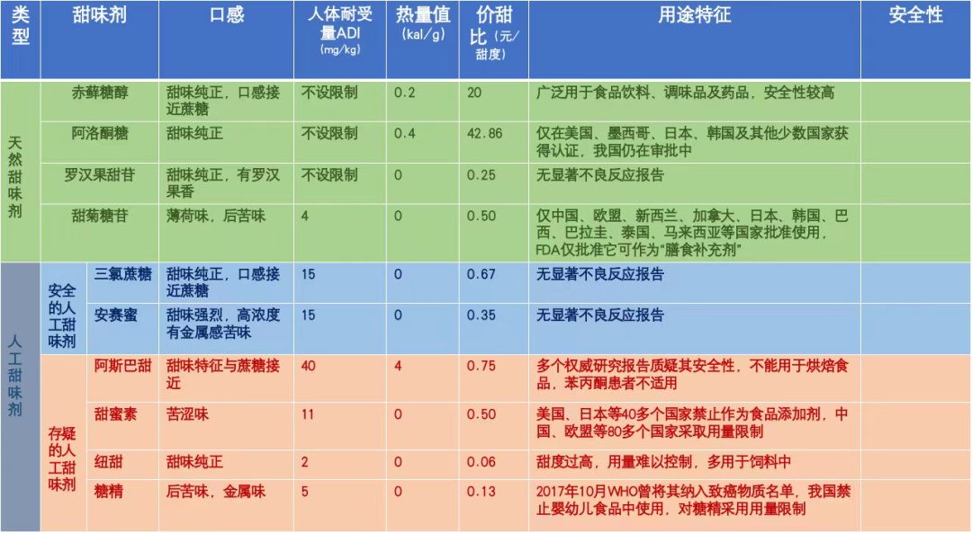 随着阿斯巴甜等人工合成甜味剂的安全性在全球范围内引发不少质疑,来源于植物的天然甜味剂成为更多“无糖”产品的优选。常见的天然甜味剂包括赤藓糖醇、甜菊糖苷、罗汉果苷等,而在10多项甜味剂的评比中,赤藓糖醇安全性最高。