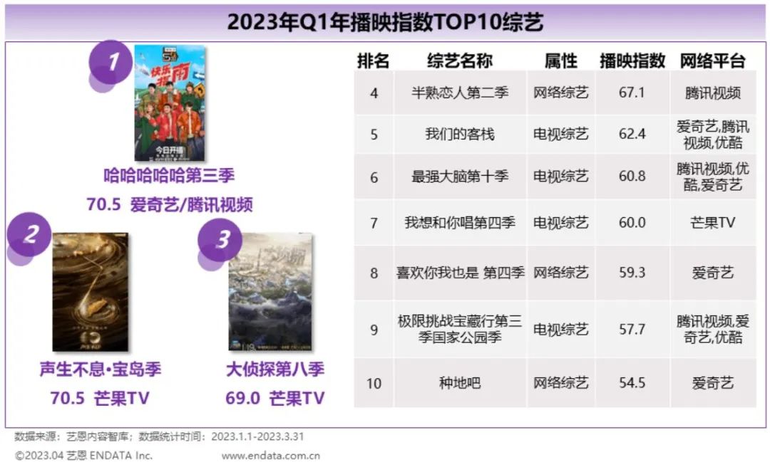 降本增效、减量提质的大背景下,上半年综艺行业交出的成绩单并不亮眼,这从艺恩的播映指数便能明显看出,2023年Q1,仅有《哈哈哈哈哈第三季》《声生不息·宝岛季》的播映指数超过70。市场能否回暖、综艺能否证明自身的价值、能否重新带给品牌方信心,对视频平台来说至关重要,而压力集中在了下半年。