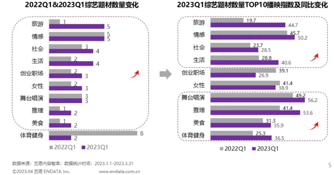 从规模上来讲,旅行题材是2023年变化最显著的题材。2022年Q1,旅行类综艺数量仅有1部,而2023年Q1则上升到了5部,艺恩数据显示,2023年Q1,旅行题材是各大综艺题材中播映指数同比提升最大的。开年后,大众积压的旅行需求得以释放,线下旅游业全面复苏,行业的回暖也影响了综艺市场的创作趋势。