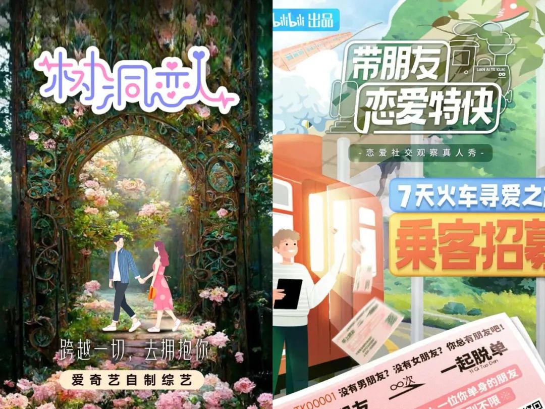 相比于音综,走过近五年时间的恋综对细分群体的挖掘已经面面俱到了,过往恋综对情侣、夫妻、单身、已婚、离婚人群等均有覆盖,因此,2023年恋综的求新更多体现在“整花活”上,如腾讯视频的《第三人称》打出了“前任为你披荆斩棘”的旗号,爱奇艺的《树洞恋人》设定为“带着秘密的恋爱旅程”,B站的《带朋友恋爱特快》的特色是“4对好友结伴上火车,互为彼此的电灯泡”。