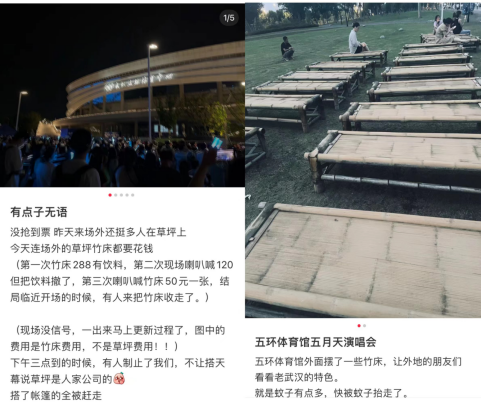 在场外,洞察到商机的商家,则直接在五环体育场外摆上了竹床。躺平听歌、晚风惬意,看似是一个十分不错的选择,但令人震惊的是,一个床位加几瓶水,定价却到了288元,更遑论夏日夜间还有成群结队的蚊虫。