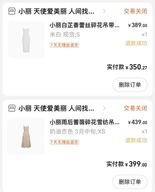 然后我就下单了两条仙女裙,其中有一条还是预售,我3月7日下单,等了一周才发货。不过现实是惨痛的,两条裙子无一例外,都退了。
