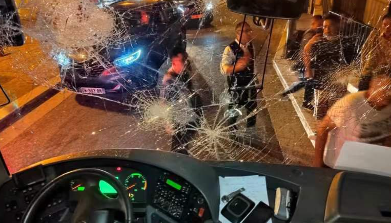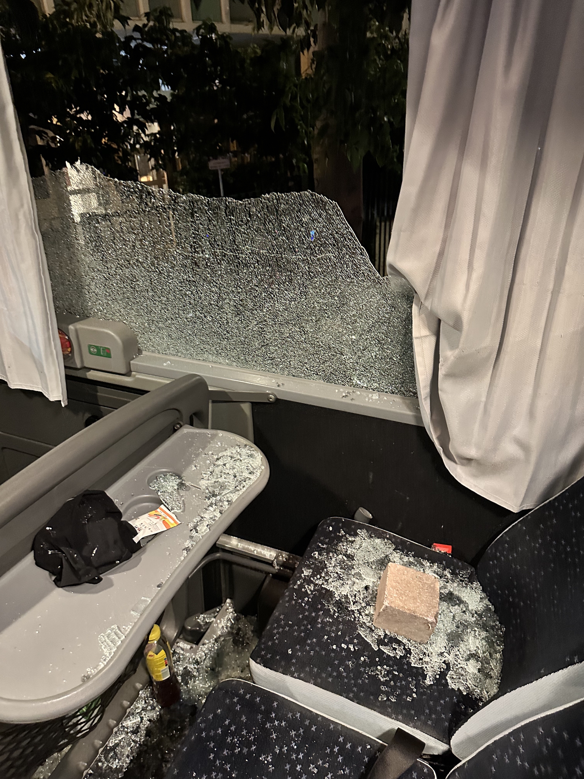 赵蔷觉得情况有些异常,心生警惕,紧接着这些人就开始冲着车子喊叫。赵蔷赶紧提醒车上的同伴拉上窗帘,几秒钟后,她听到了重物砸击车窗的声音。一开始是车辆的前部遭受到攻击,接着她所在的车窗也开始被击打,车内的小朋友听到砸击的声音都吓坏了。两分钟之内,车窗就被这些蒙面人砸透,有砖头和重物被投掷进车内。