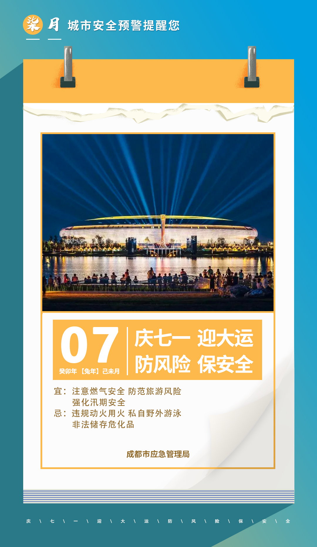 7月,强对流天气增多,短时强降雨、大风、雷电给灾害事故防范应对带来挑战。局地短时强降雨易诱发崩塌、滑坡、泥石流等地质灾害,西部山区和东部龙泉山脉高陡斜坡、旅游景区、农村斜坡建房、非煤矿山高陡边坡等区域的地质灾害风险较高。城市低洼地带、下穿式立交桥、地下隧道易因排水不畅,出现积水现象,影响地铁、车辆、行人通行安全。强降雨带来的大风增加城市供电设施、户外广告牌、高大乔木损坏、倒伏的风险。地势低洼区域忌水危险化学品遇湿、遇水后易引发生产安全事故。