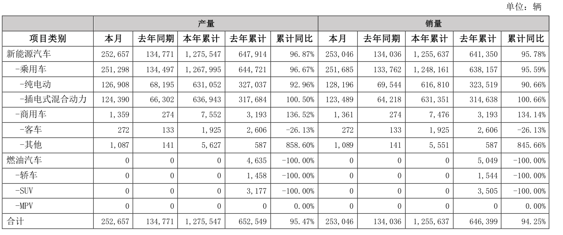 比亚迪7月2日发布2023年6月产销快报,6月销量合计25.3046万辆。上半年销量合计125.5637万辆,同比增长94.25%。新能源汽车6月合计销量25.3046万辆,本年累计销量125.5637万辆,同比增长95.78%。