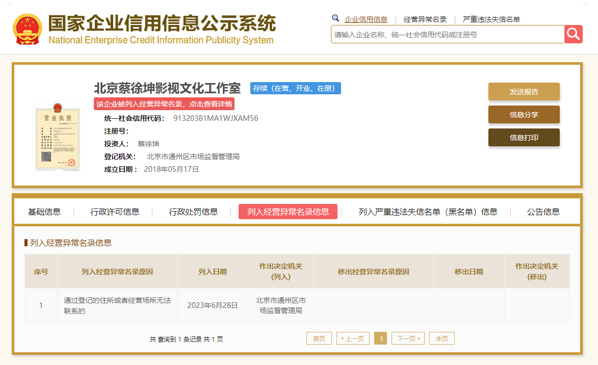 信息显示,6月28日,北京市通州区市场监督管理局因“通过登记的住所或者经营场所无法联系”,将北京蔡徐坤影视文化工作室列入经营异常名录。