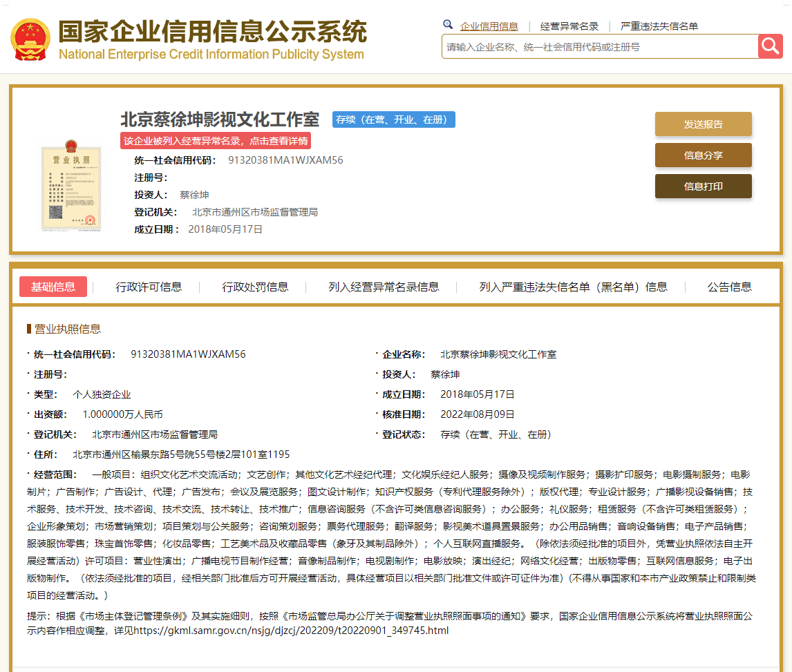 国家企业信用信息公示系统显示,6月28日,北京蔡徐坤影视文化工作室被列入经营异常名录。