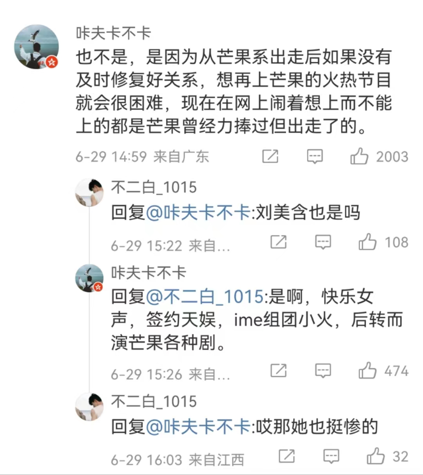 也正因为这样,张睿、刘美含屡次被拒的经历让不少网友为之意难平,并在头脑风暴中分析落选原因——有网友表示没流量是原罪;也有网友猜测是他们当年从芒果出走后续没有搞好关系,故而难以再合作,又或许,他们的实力与流量处于中等地位,缺少核心竞争力,可替换性太强……至于真实原因到底是怎样,我们不得而知。