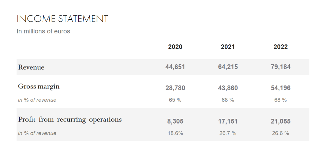 2020年-2022年,LVMH集团的营收分别为446.51亿欧元(约合人民币3533.6亿元)、642.15亿欧元(约合人民币5081.9亿元)和791.84亿欧元(约合人民币6266.5亿元),同比增长-16.85%、43.81%和23.31%。