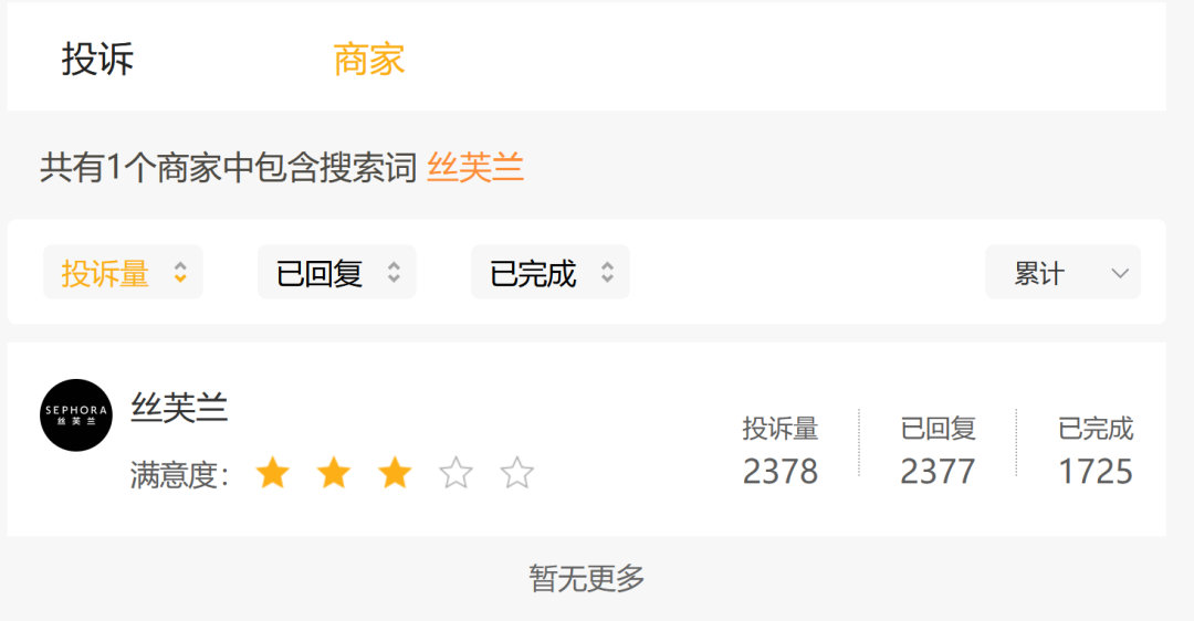 新浪旗下消费者投诉平台“黑猫投诉”显示,截至7月2日,关于丝芙兰的投诉量高达2378条,遭消费者投诉的原因主要包括退货长时间不退款、不按约定的赠品发货以及发临期商品等。仪美尚同时发现,与丝芙兰进入中国同一时期成立的某国内大型美妆零售,在“黑猫投诉”的投诉量为56件。