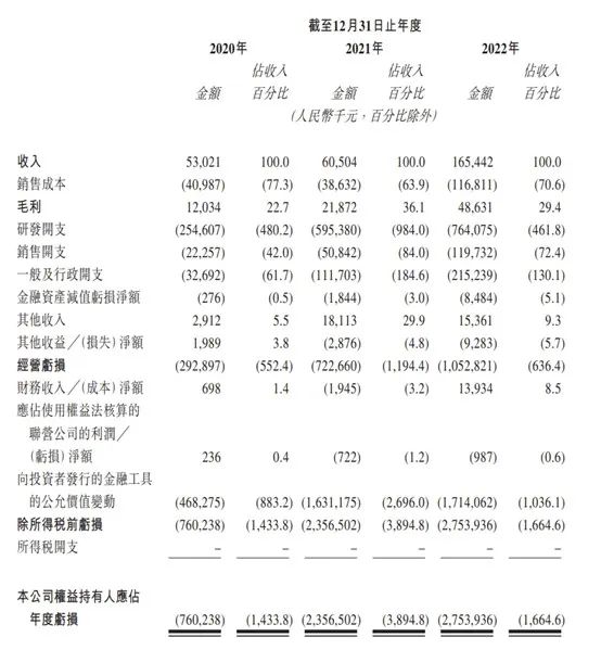 在业绩方面,招股书显示2020年、2021年及2022年,黑芝麻智能营收分别为5302万元、6050万元及1.65亿元;经营亏损为2.93亿元、7.23亿元以及10.53亿元;归属于股东的净亏损分别是7.6亿元、23.565亿元、27.539亿元,3年累计亏损高达58.7亿元;经调整净亏损为2.73亿元、6.14亿元以及7亿元。