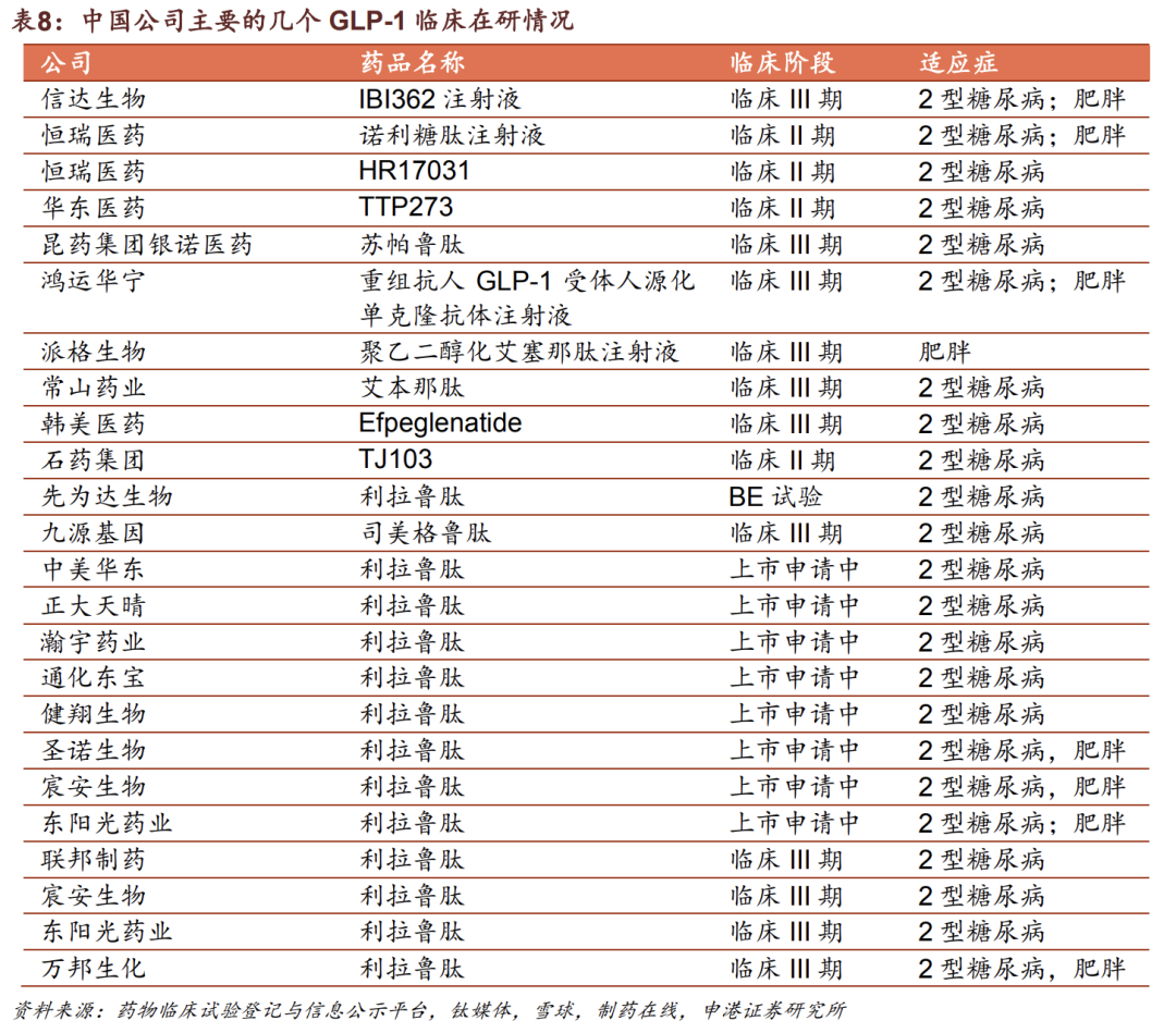 其中,第一代GLP-1,利拉鲁肽国内专利已经过期,仿制门槛最低,正大天晴、翰宇医药、通化东宝等20家企业均已提交生物类似药的上市申请。